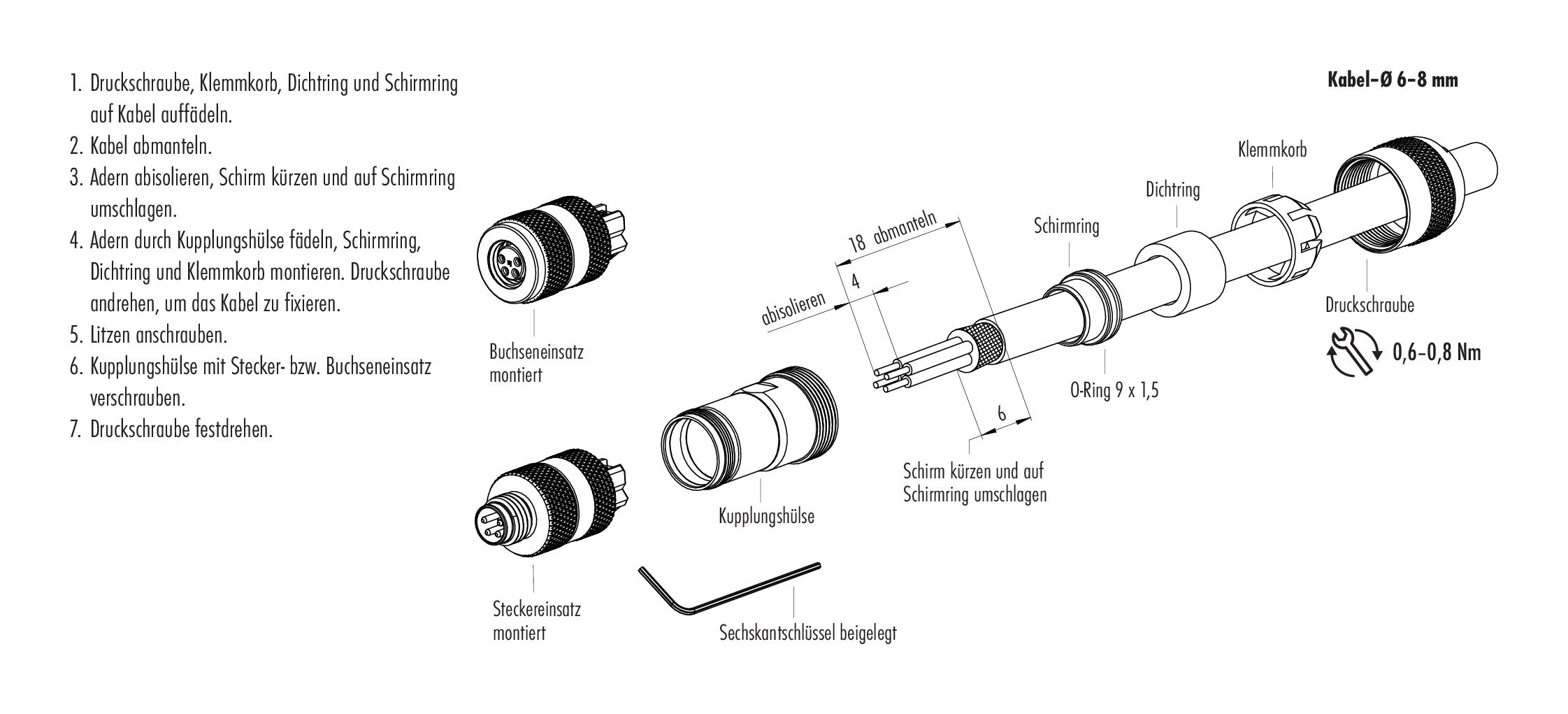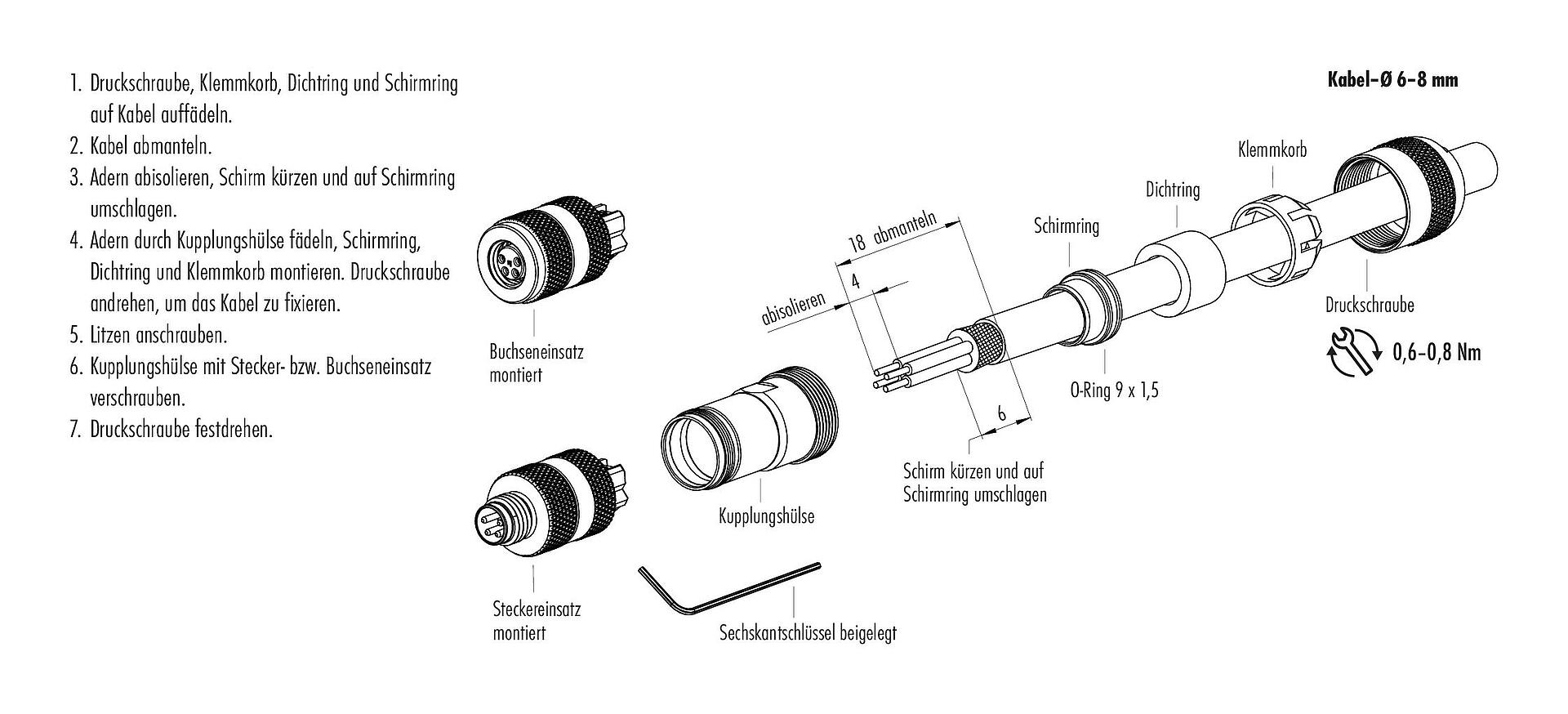8. Zum Verriegeln des Kabelsteckverbinders mit dem Gerätesteckverbinder wird der Gewindering „handfest“ (ca. 50 cNm) angezogen.