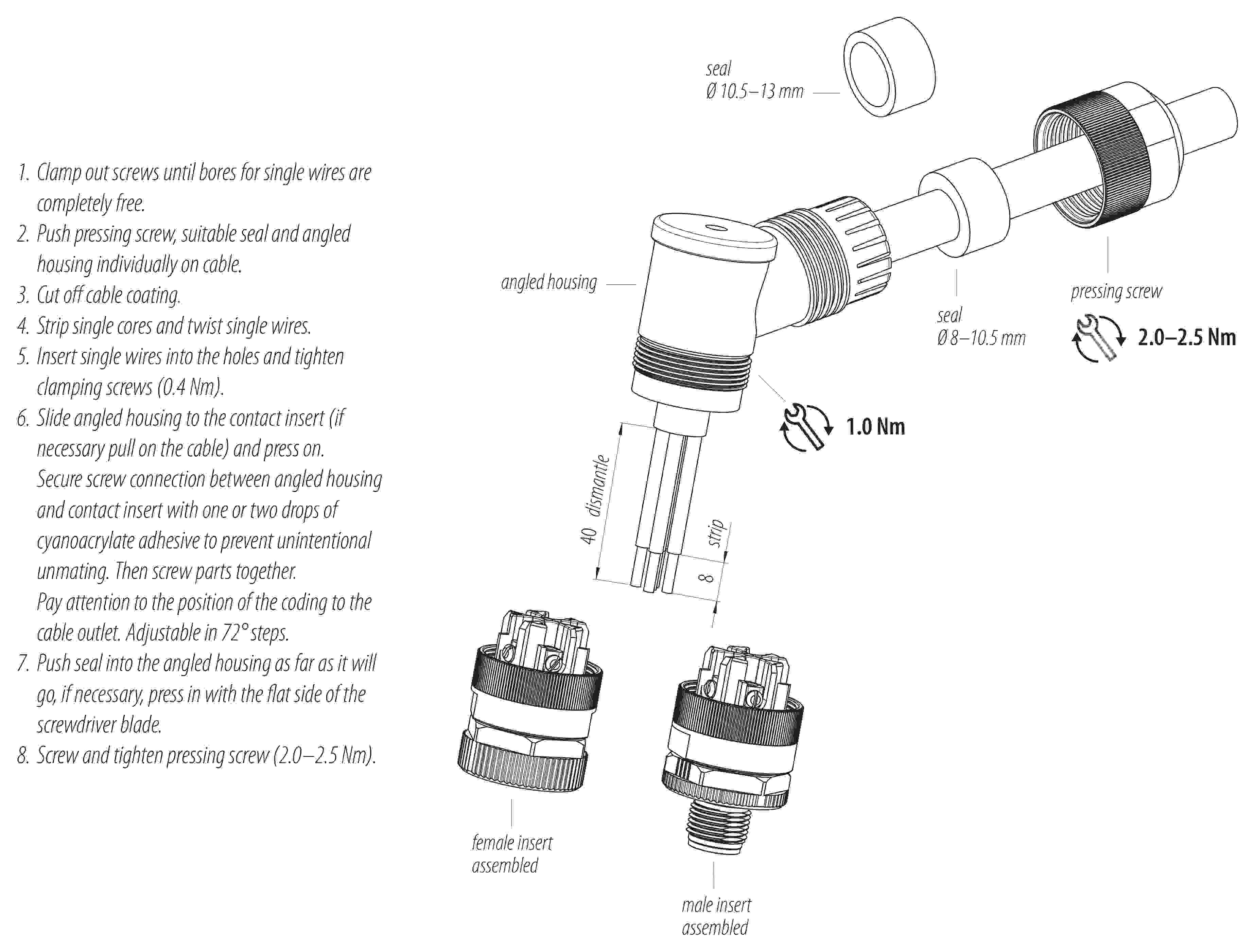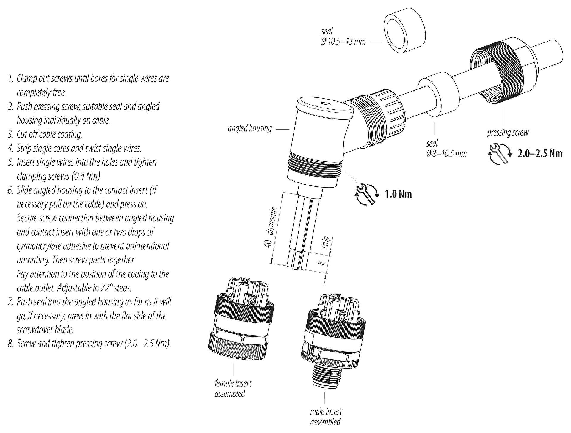 - Pour éviter l'ouverture involontaire du connecteur, lorsqu'il est utilisé dans des circuits dont la tension est dangereuse au toucher, le fil entre le boîtier et la tête du connecteur doit être fixé avec un adhésif cyanoacrylate approprié. Ceci ne s'applique pas aux connecteurs utilisés dans les circuits SELV et PELV selon la norme IEC 61140 (EN 61140, VDE 0140-1).