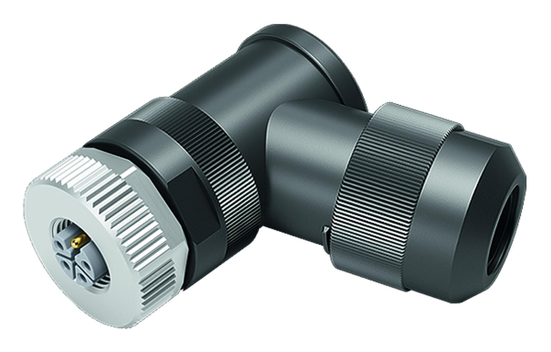M12 Connecteur femelle coudé, Contacts: 4+FE, 8,0-13,0 mm, non blindé, pince à visser, IP67, M12x1,0, pour l'alimentation électrique, UL 2237 en préparation, avec connexion PE