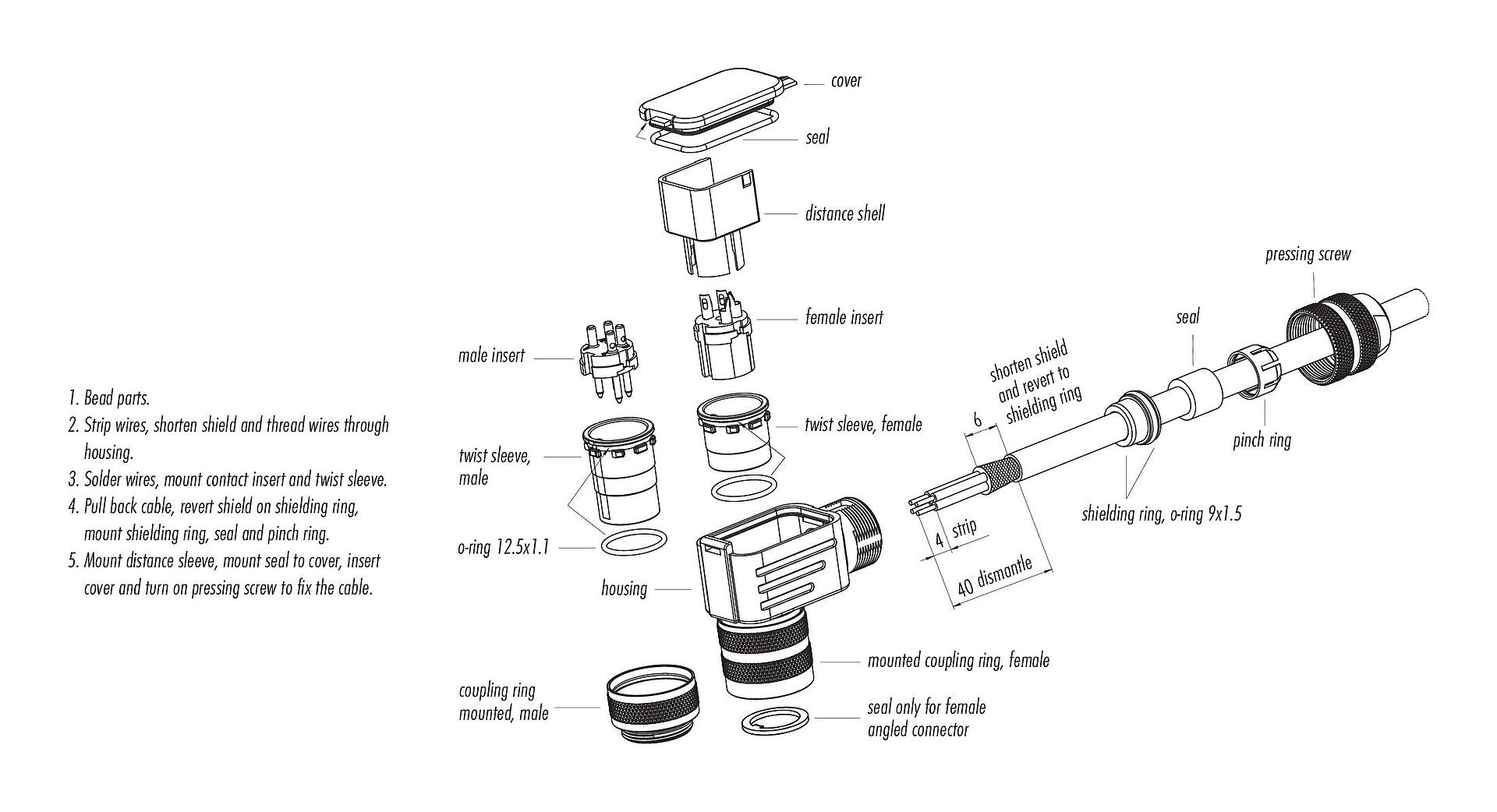 - Per proteggere dall'apertura involontaria del connettore, la filettatura tra l'alloggiamento e la testa del connettore deve essere fissata con un adesivo cianoacrilato adatto quando viene utilizzato in circuiti con tensioni pericolose al tatto. Questo non vale per i connettori utilizzati in circuiti SELV e PELV secondo IEC 61140 (EN 61140, VDE 0140-1).