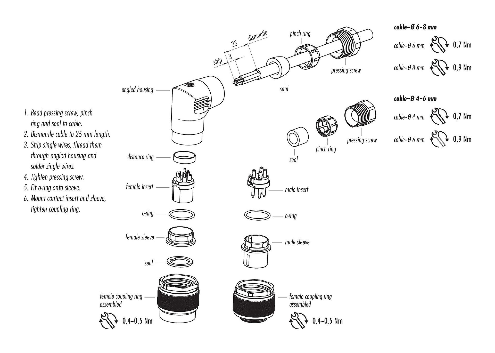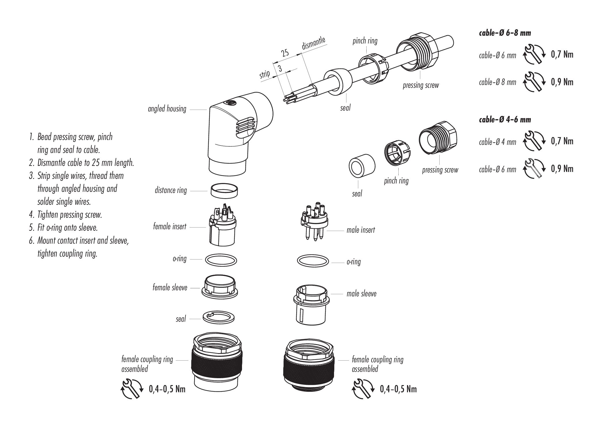 3. Liittimen tahattoman avaamisen estämiseksi kotelon ja liitinpään välinen lanka on kiinnitettävä sopivalla syanoakrylaattiliimalla, kun sitä käytetään piireissä, joiden jännite on vaarallinen koskettaa. Tämä ei koske liittimiä, joita käytetään SELV- ja PELV-piireissä standardin IEC 61140 (EN 61140, VDE 0140-1) mukaisesti.