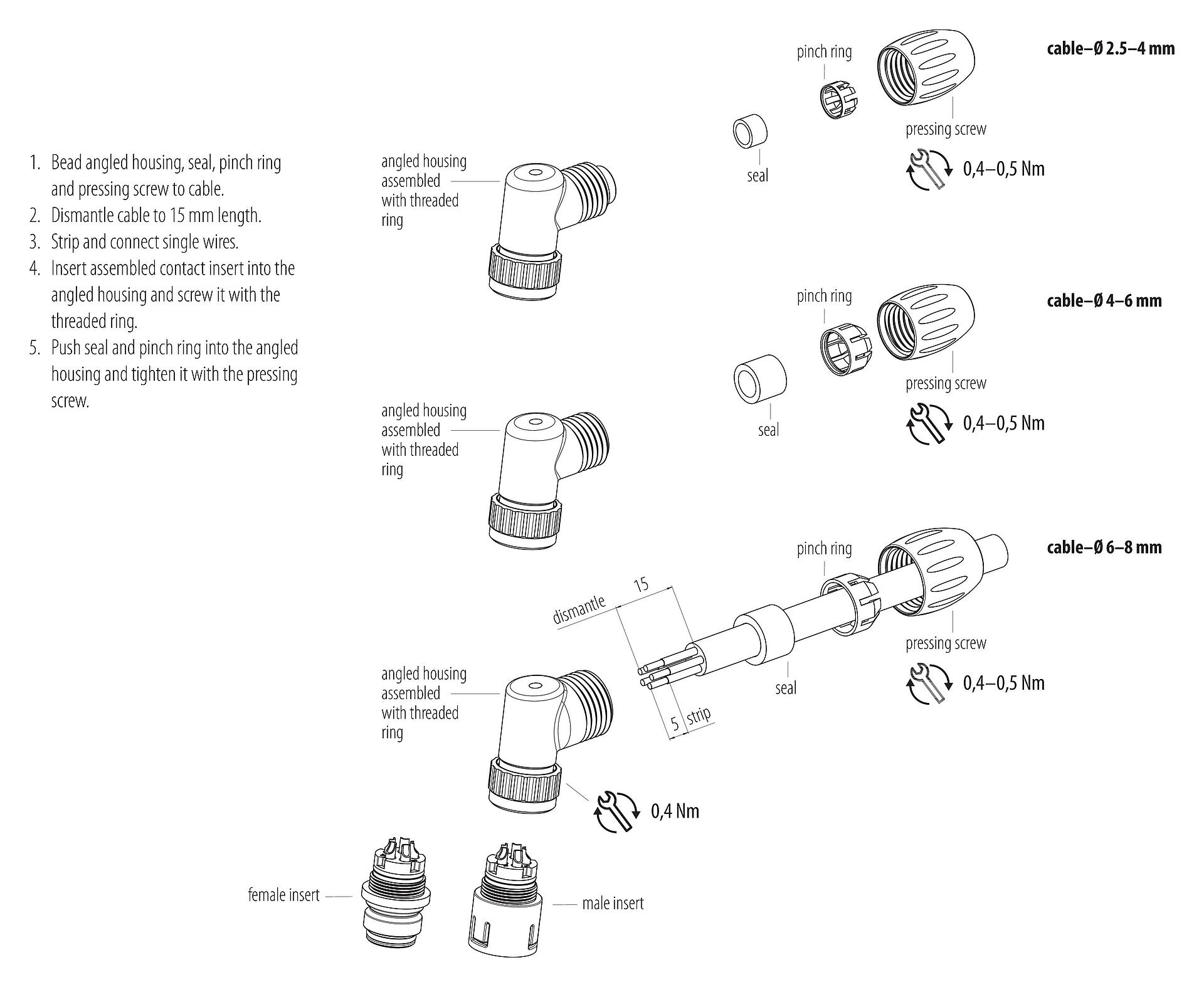 - Ter bescherming tegen onbedoeld openen van de connector, moet de schroefdraad tussen de behuizing en de connectorkop met een geschikte cyanoacrylaatlijm worden beveiligd bij gebruik in circuits met aanraakgevaarlijke spanningen. Dit geldt niet voor connectoren die worden gebruikt in SELV- en PELV-circuits volgens IEC 61140 (EN 61140, VDE 0140-1).