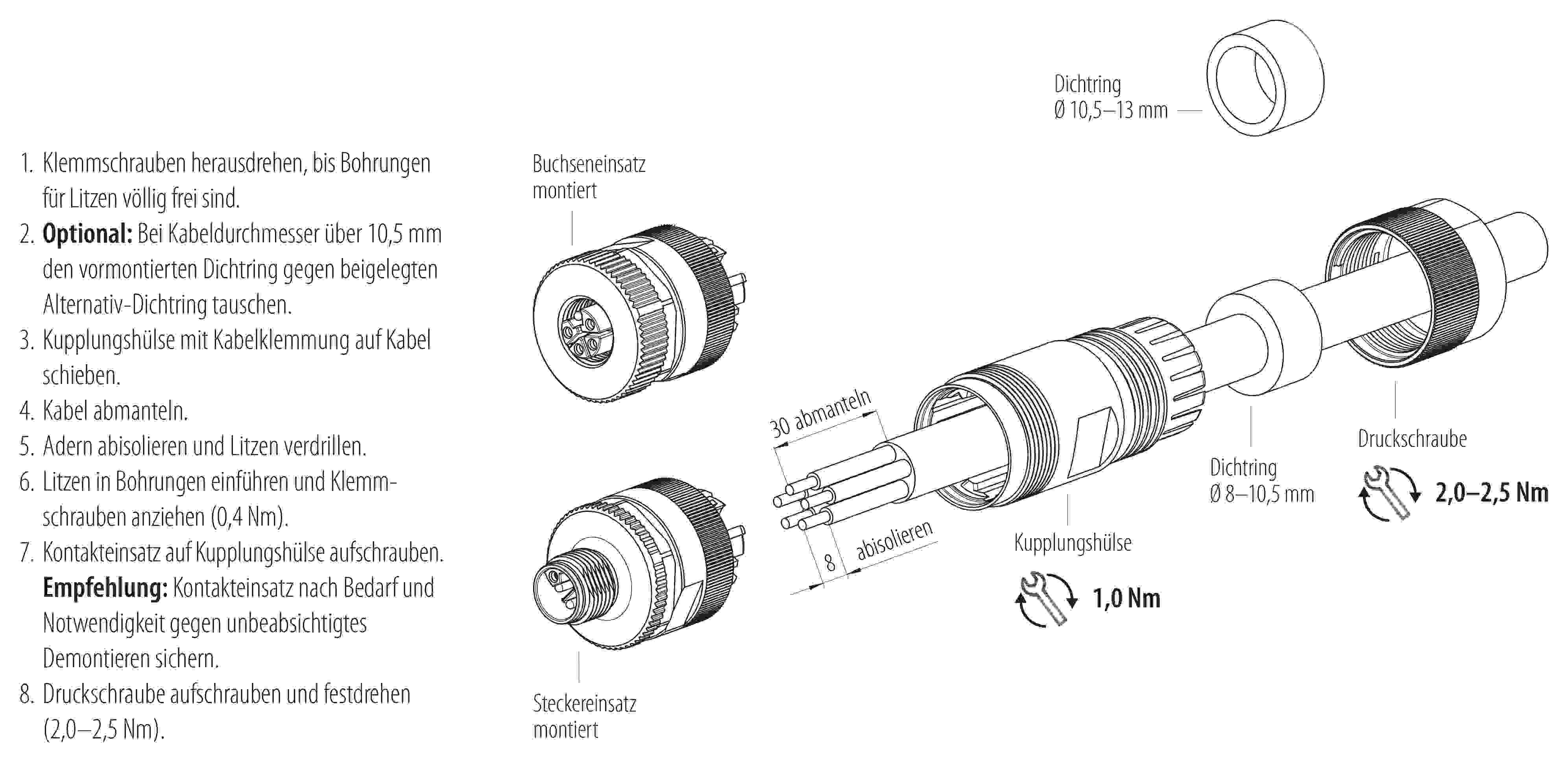 - Zum Verriegeln des Kabelsteckverbinders mit dem Gerätesteckverbinder wird der Gewindering „handfest“ (ca. 60 cNm) angezogen.