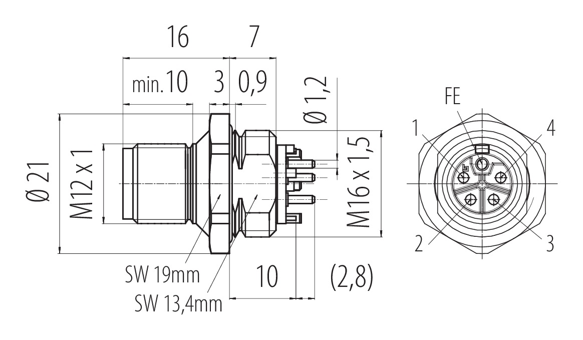 M12 Flanschstecker, Polzahl: 4+FE, ungeschirmt, THR, IP67, UL 2238, M16x1,5, Frontmontage