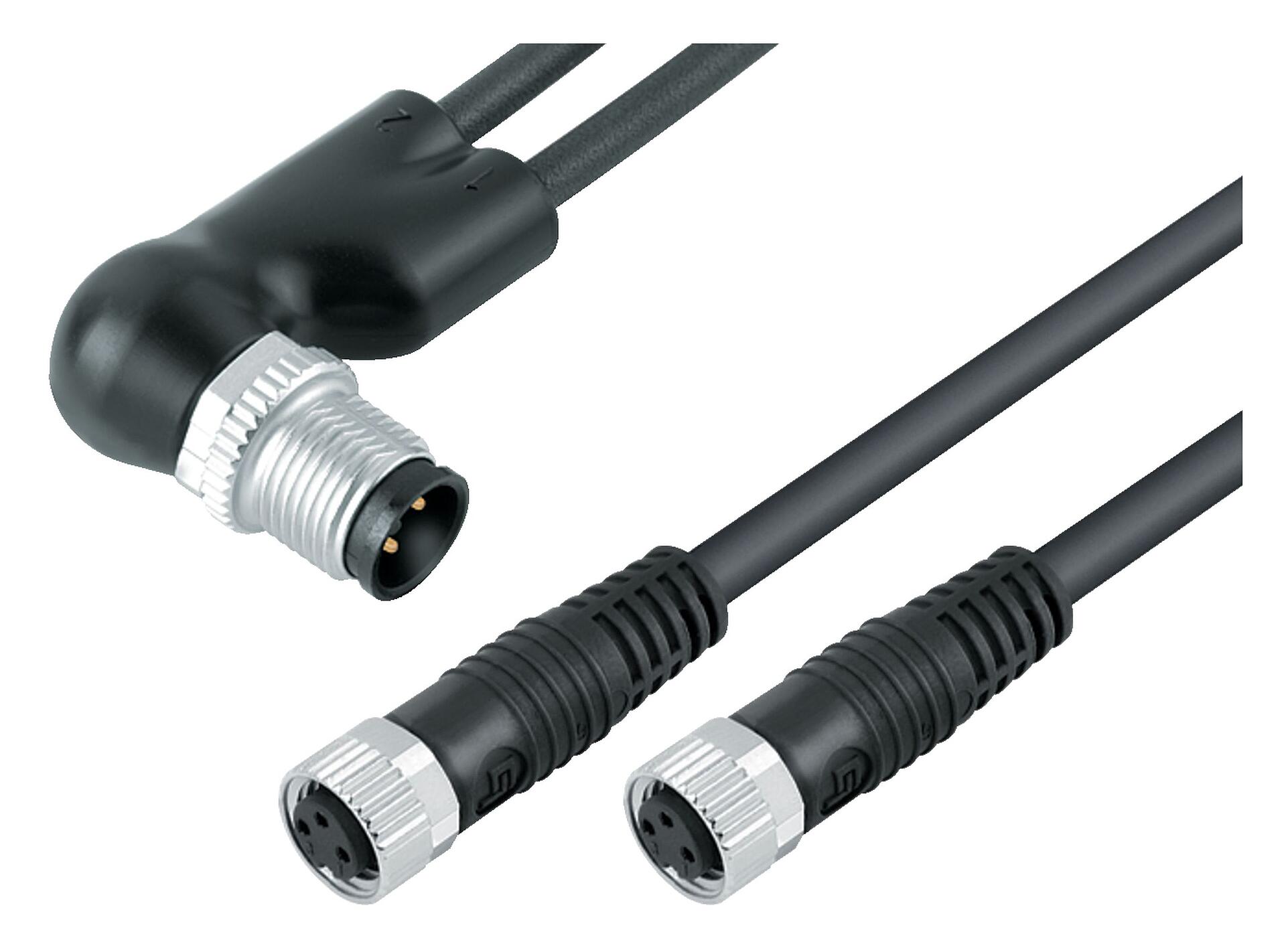 M12/M8 Kabelsplitter Winkelstecker - 2 Kabeldosen, Polzahl: 4/3, ungeschirmt, am Kabel angespritzt, IP67, UL 2238, PUR, schwarz, 3 x 0,34 mm², 1 m