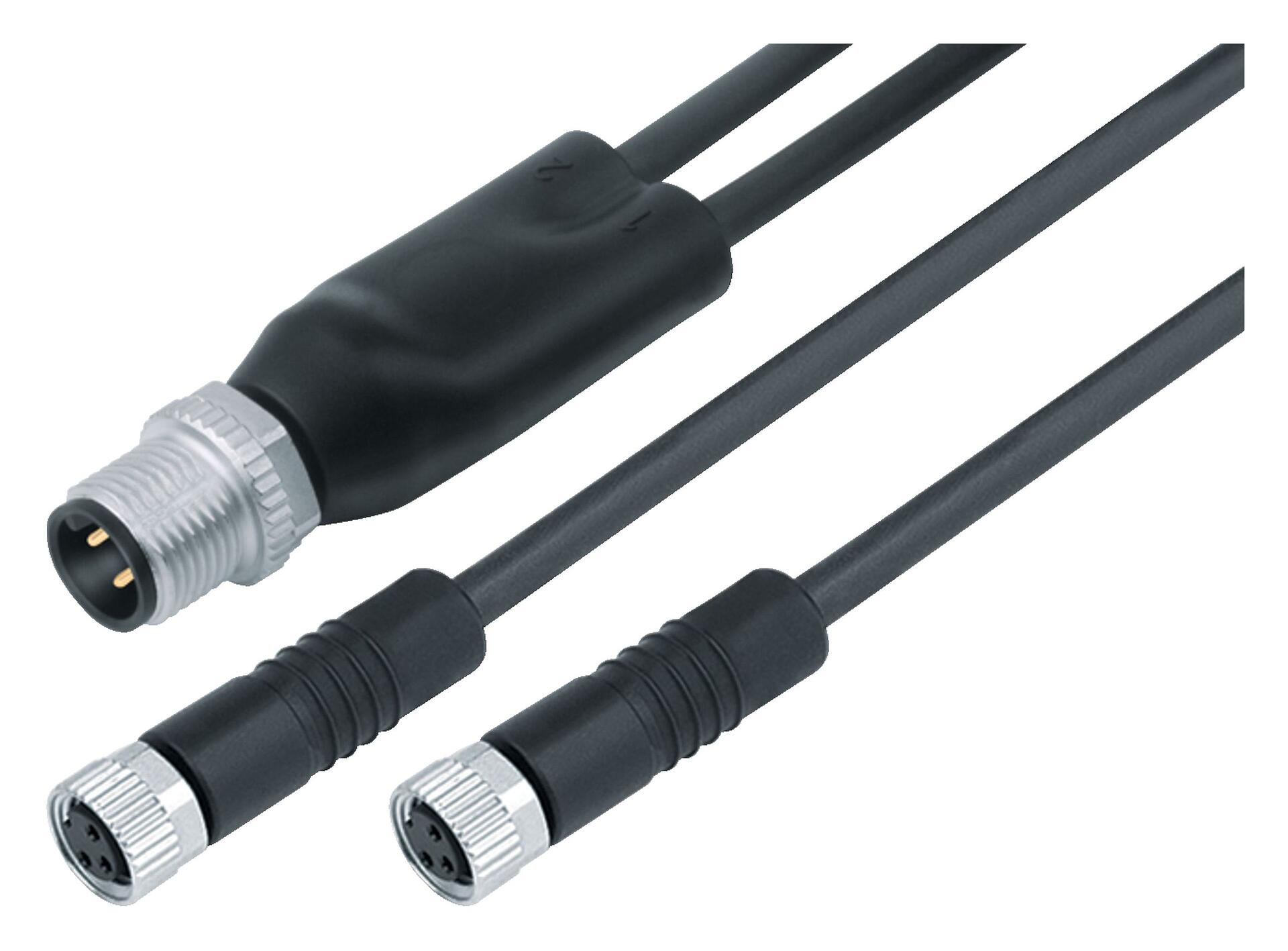 M12/M8 Kabelsplitter Kabelstecker - 2 Kabeldosen, Polzahl: 4/3, ungeschirmt, am Kabel angespritzt, IP67, UL 2238, PUR, schwarz, 3 x 0,34 mm², 1 m
