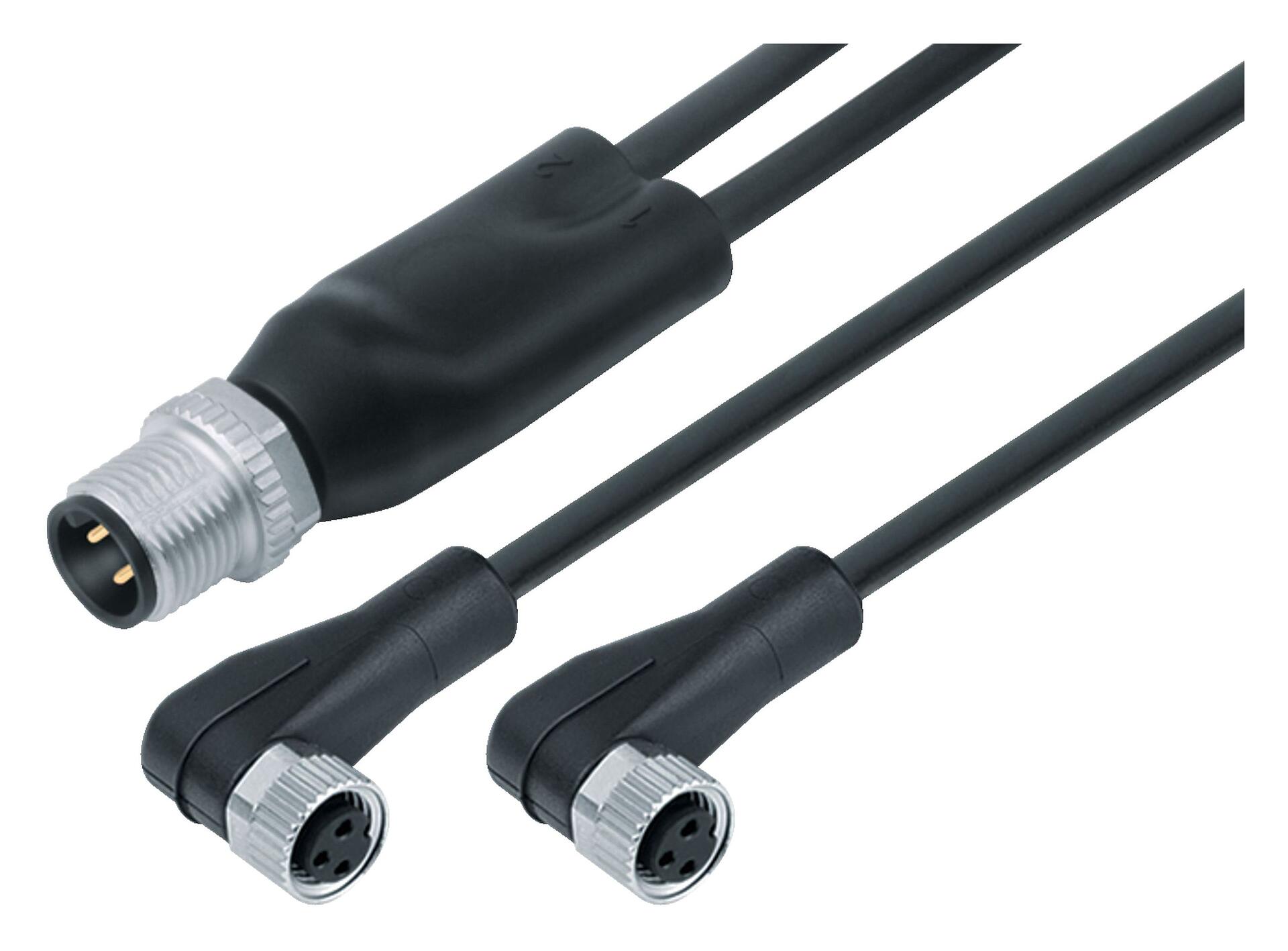 M12/M8 Kabelsplitter Kabelstecker - 2 Winkeldosen, Polzahl: 4/3, ungeschirmt, am Kabel angespritzt, IP67, UL 2238, PUR, schwarz, 3 x 0,34 mm², 1 m