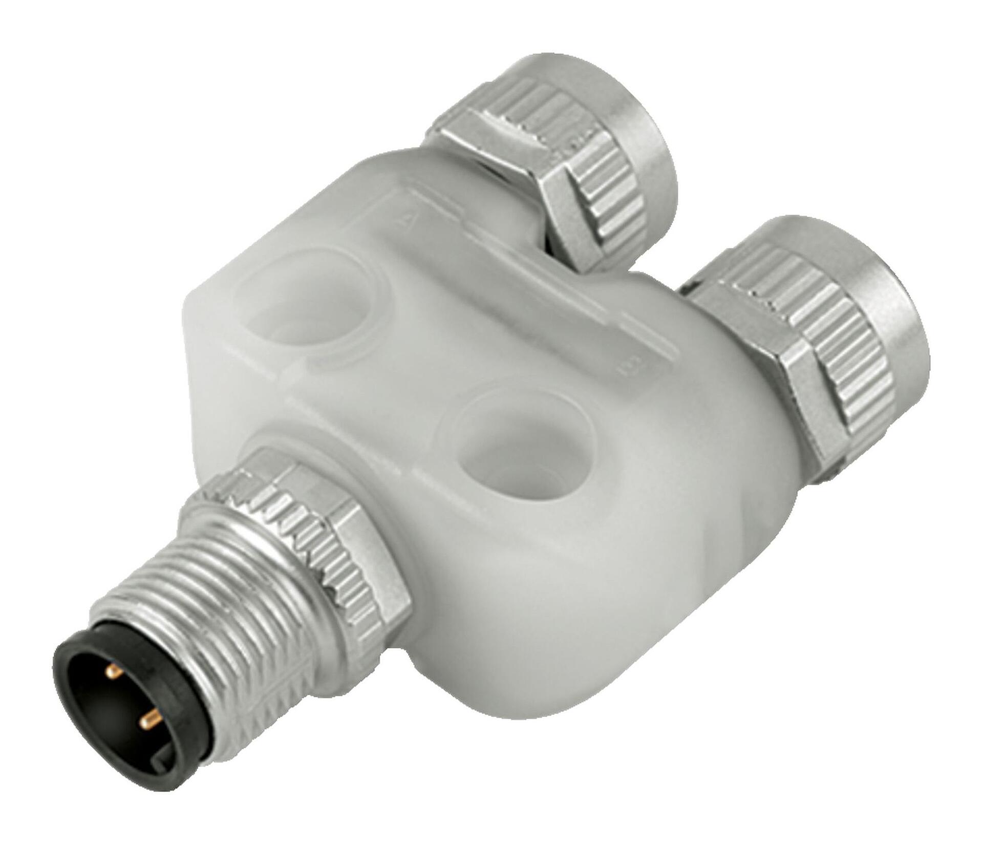 M12 Zweifachverteiler, Y-Verteiler, Stecker - 2 Dosen, Polzahl: 4/3, ungeschirmt, steckbar, IP68, UL 2238, mit LED PNP