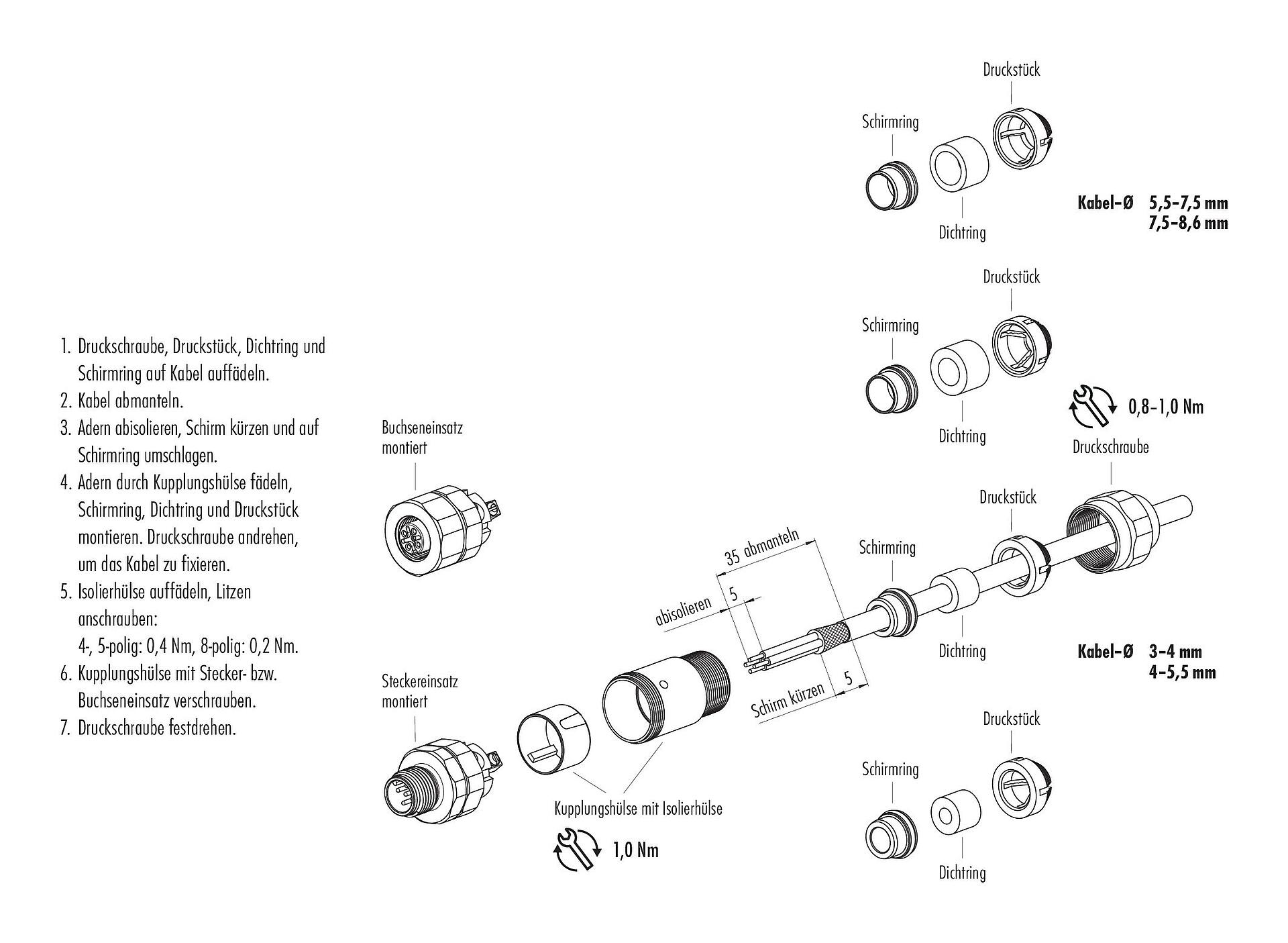 - Zum Verriegeln des Kabelsteckverbinders mit dem Gerätesteckverbinder wird der Gewindering „handfest“ (ca. 60 cNm) angezogen.