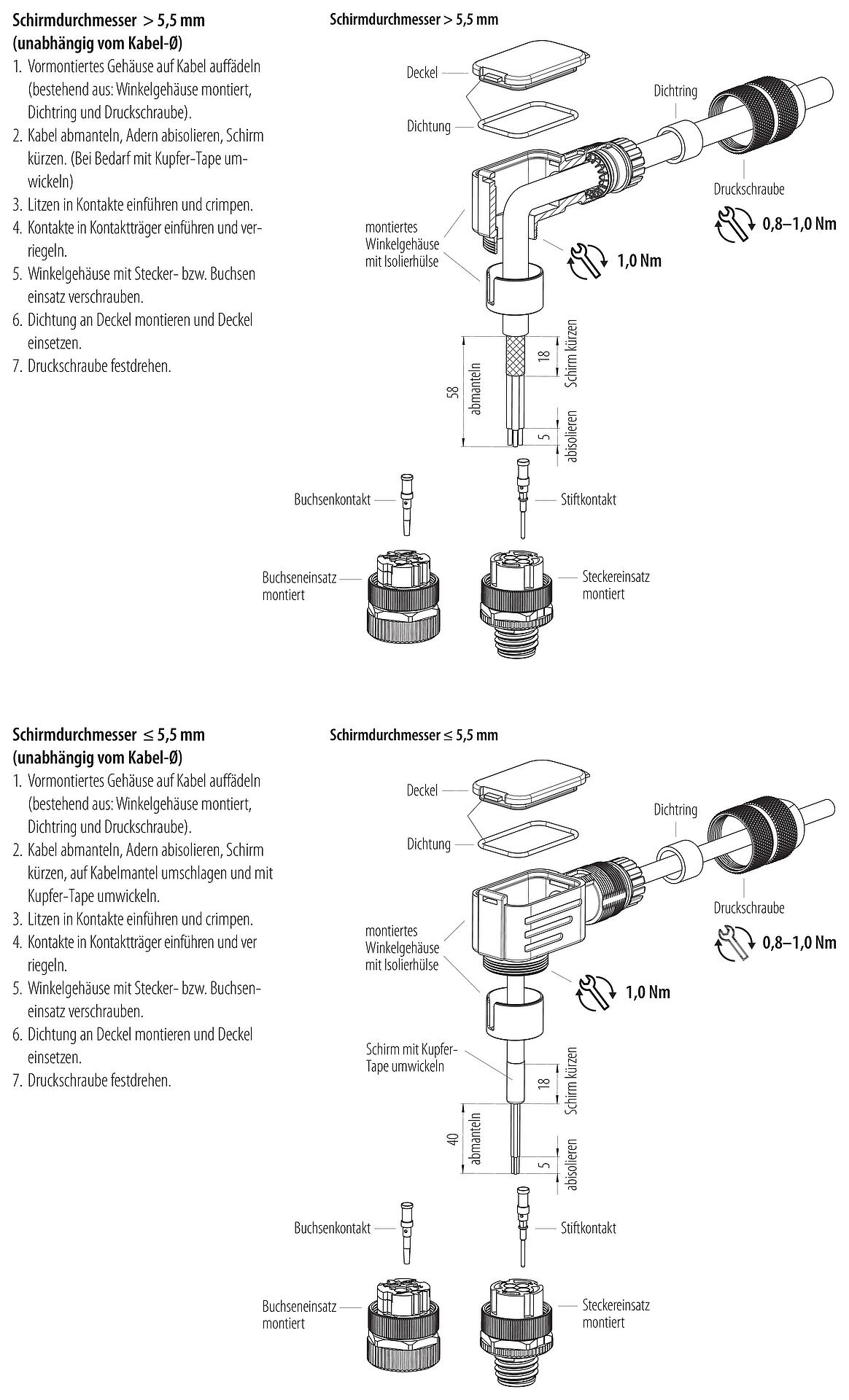 - Zum Schutz gegen unbeabsichtigtes Öffnen des Steckverbinders, ist bei einem Einsatz in Stromkreisen mit berührungsgefährlichen Spannungen das Gewinde zwischen dem Gehäuse und dem Steckverbinderkopf mit einem geeigneten Cyanacrylatkleber zu sichern. Dies gilt nicht für Steckverbinder, die in SELV und PELV Stromkreisen nach IEC 61140 (EN 61140, VDE 0140-1) eingesetzt werden.