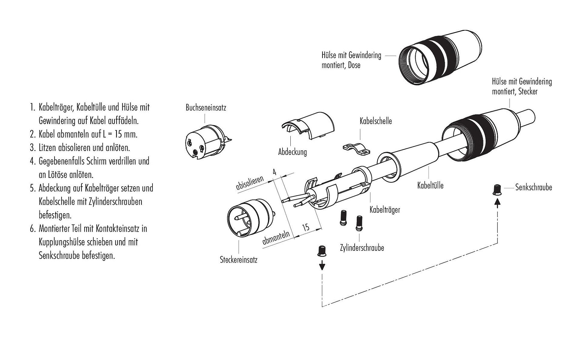 - Zum Schutz gegen unbeabsichtigtes Öffnen des Steckverbinders, ist bei einem Einsatz in Stromkreisen mit berührungsgefährlichen Spannungen das Gewinde zwischen dem Gehäuse und dem Steckverbinderkopf mit einem geeigneten Cyanacrylatkleber zu sichern. Dies gilt nicht für Steckverbinder, die in SELV und PELV Stromkreisen nach IEC 61140 (EN 61140, VDE 0140-1) eingesetzt werden.