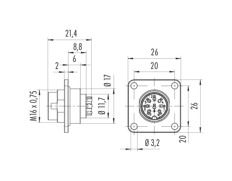 4. M16 Vierkant-Flanschstecker, Polzahl: 8 (08-a), ungeschirmt, crimpen (Crimpkontakte müssen separat bestellt werden), IP68, UL 2238, AISG konform, M3 (4x), Frontmontage