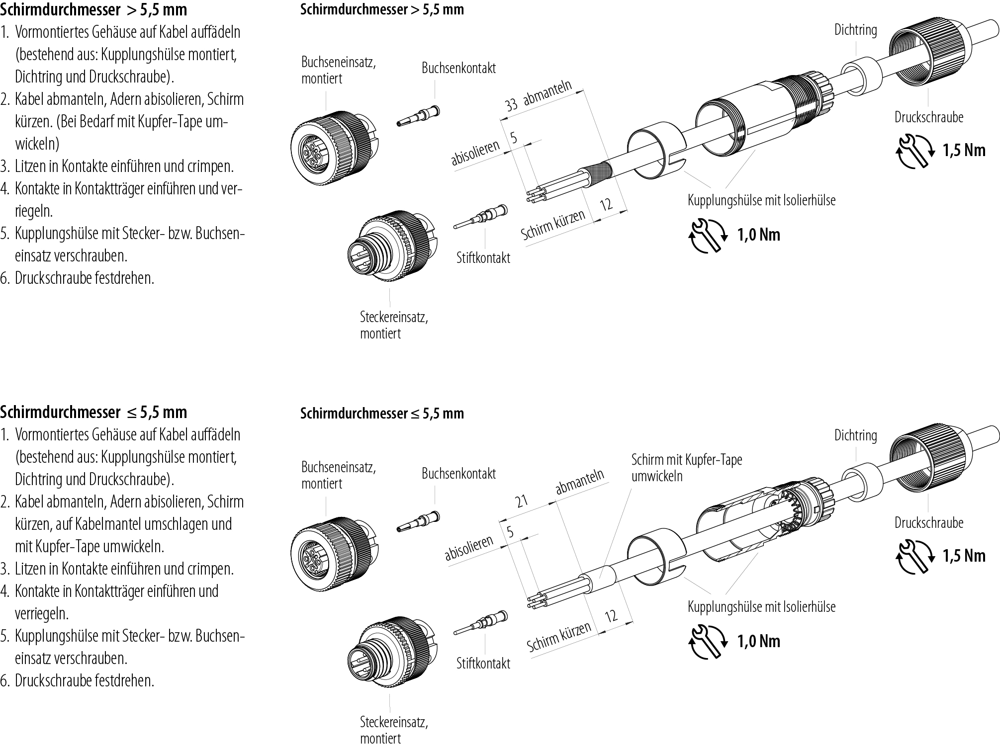 3. Zum Schutz gegen unbeabsichtigtes Öffnen des Steckverbinders, ist bei einem Einsatz in Stromkreisen mit berührungsgefährlichen Spannungen das Gewinde zwischen dem Gehäuse und dem Steckverbinderkopf mit einem geeigneten Cyanacrylatkleber zu sichern. Dies gilt nicht für Steckverbinder, die in SELV und PELV Stromkreisen nach IEC 61140 (EN 61140, VDE 0140-1) eingesetzt werden.