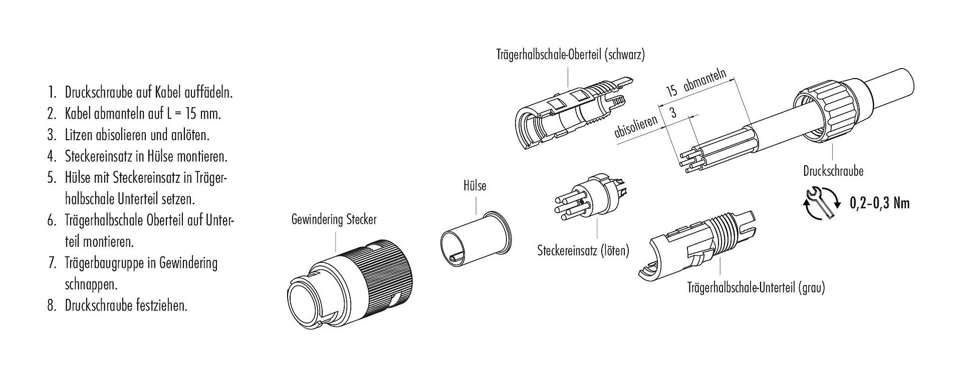 - Zum Schutz gegen unbeabsichtigtes Öffnen des Steckverbinders, ist bei einem Einsatz in Stromkreisen mit berührungsgefährlichen Spannungen das Gewinde zwischen dem Gehäuse und dem Steckverbinderkopf mit einem geeigneten Cyanacrylatkleber zu sichern. Dies gilt nicht für Steckverbinder, die in SELV und PELV Stromkreisen nach IEC 61140 (EN 61140, VDE 0140-1) eingesetzt werden.
