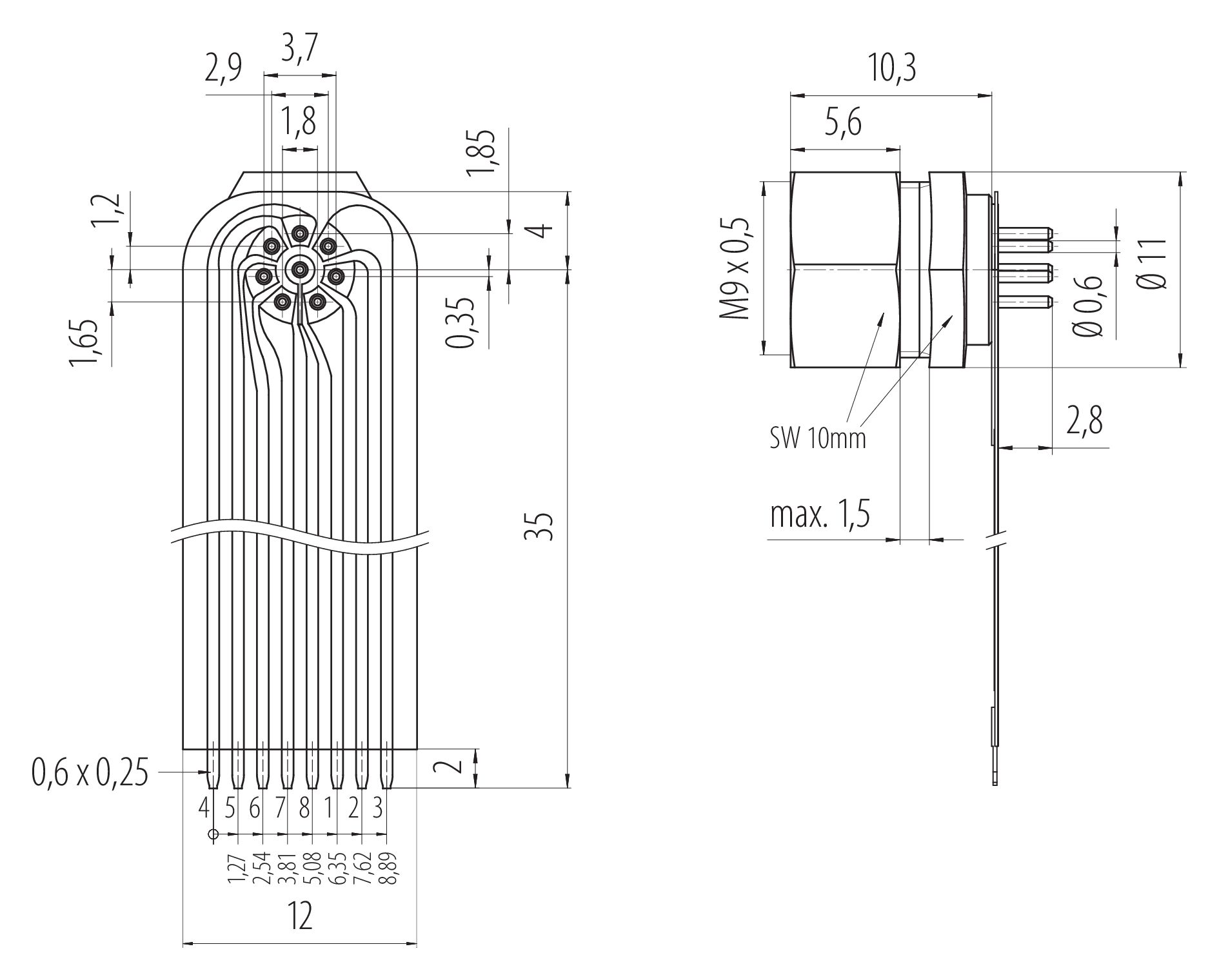 M9 Flanschdose, Polzahl: 8, ungeschirmt, THT, IP40, M9x0,5, Frontmontage