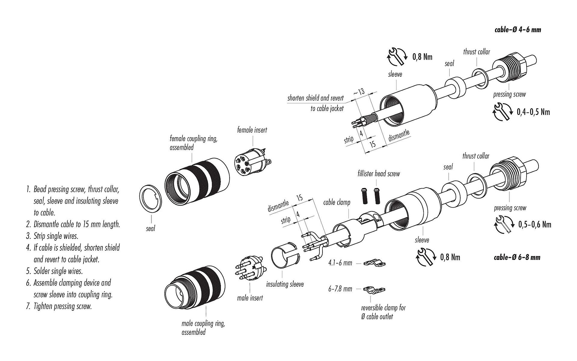- Para proteger contra la apertura involuntaria del conector, la rosca entre la carcasa y la cabeza del conector debe asegurarse con un adhesivo de cianoacrilato adecuado cuando se use en circuitos con voltajes peligrosos al tacto. Esto no se aplica a los conectores utilizados en circuitos SELV y PELV según IEC 61140 (EN 61140, VDE 0140-1).