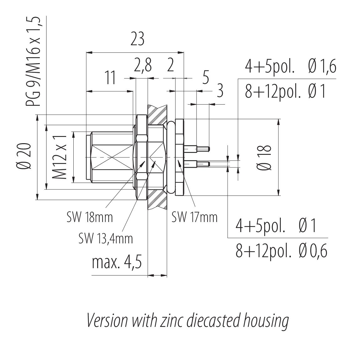 M12 panelre szerelhető csatlakozó, : 12, árnyékolatlan, THT, IP68, UL 2238, PG 9, hátsó panel felszerelés