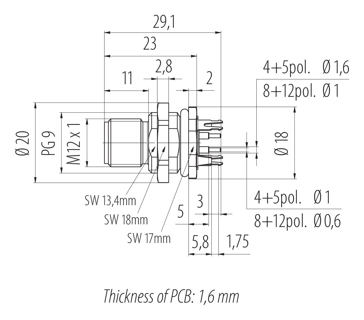 M12 panelre szerelhető csatlakozó, : 5, árnyékolható, THT, IP68, UL 2238, PG 9, hátsó panel felszerelés