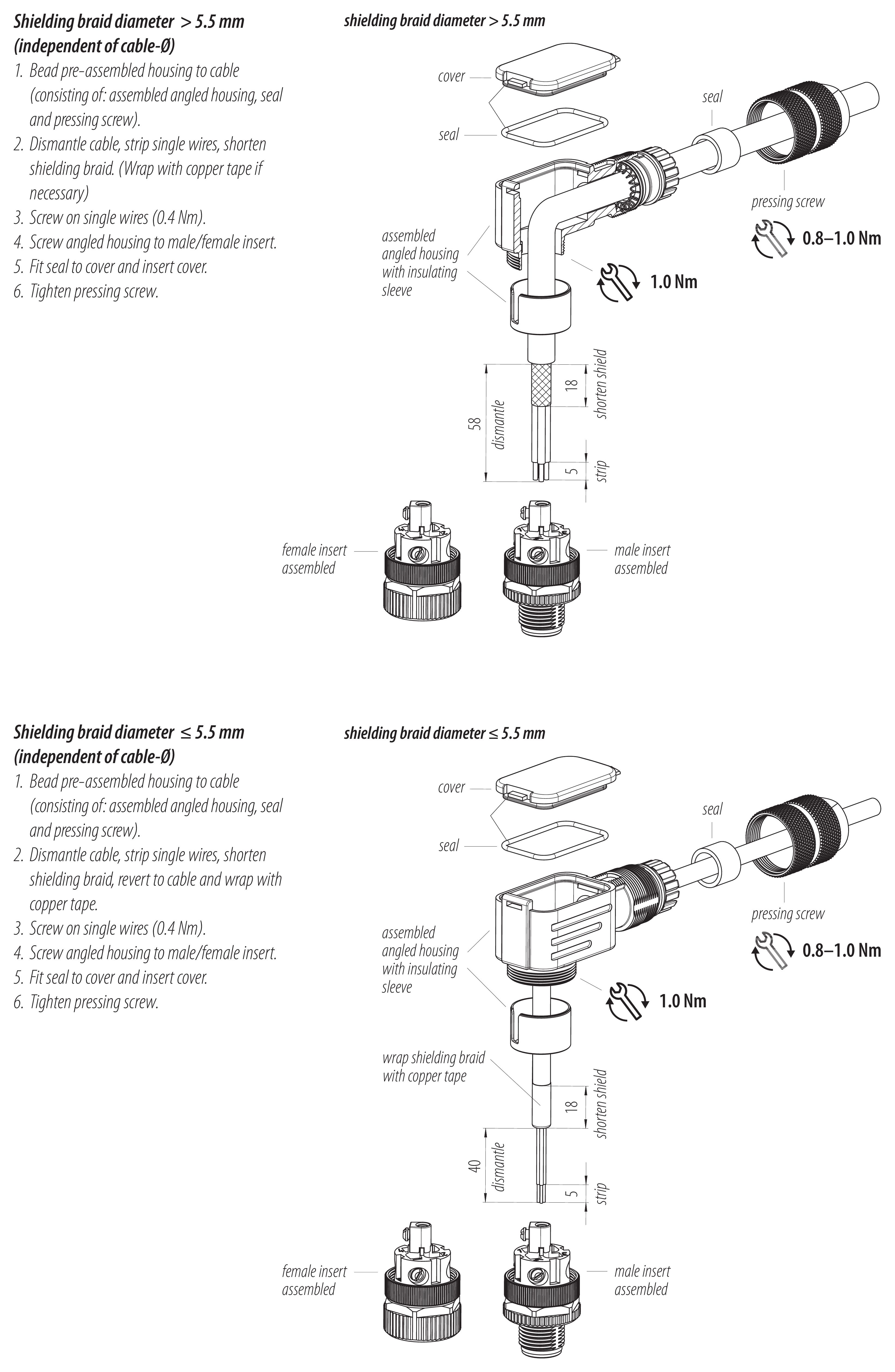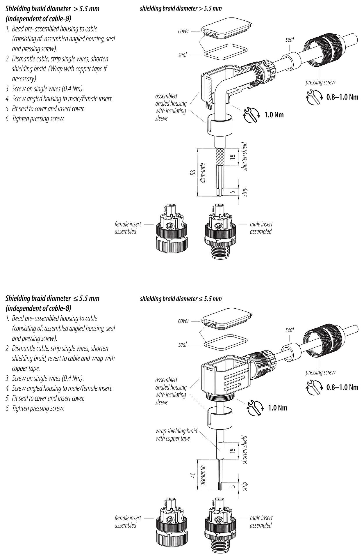 - Aby zabezpieczyć złącze przed niezamierzonym otwarciem, gwint pomiędzy obudową a głowicą złącza należy zabezpieczyć odpowiednim klejem cyjanoakrylowym w przypadku stosowania w obwodach o napięciu niebezpiecznym w dotyku. Nie dotyczy to złączy stosowanych w obwodach SELV i PELV zgodnie z IEC 61140 (EN 61140, VDE 0140-1).