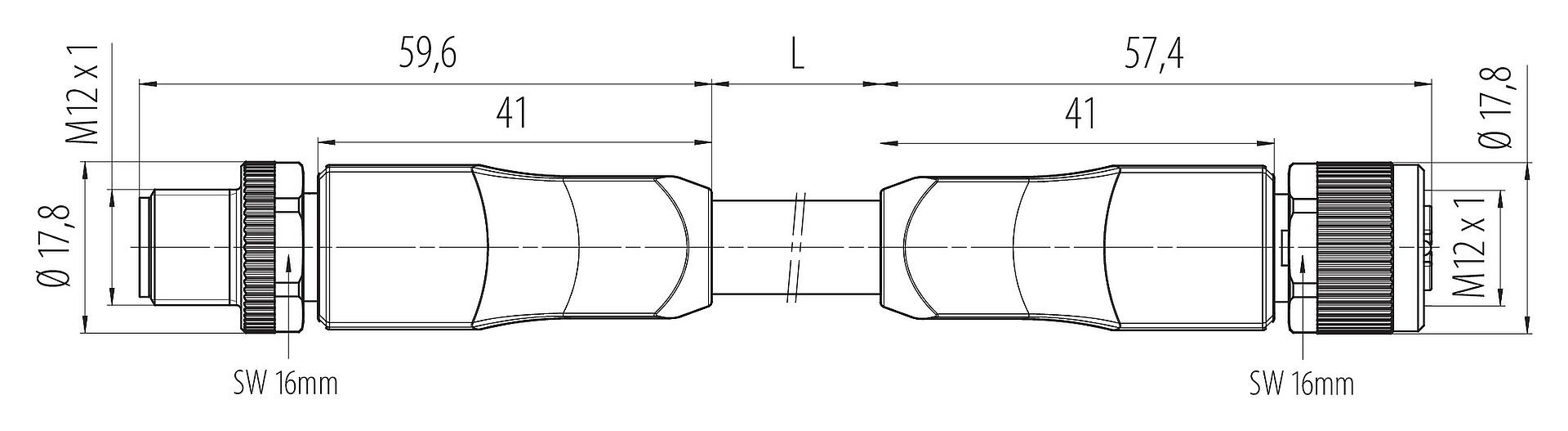 M12 Кабельный штекер - кабельная розетка, Количество полюсов: 4+PE, не экранированный, формовка на кабеле, IP68, UL 2238, PUR, черный, 5 x 2,50 мм², UL в процессе подготовки, 2 м