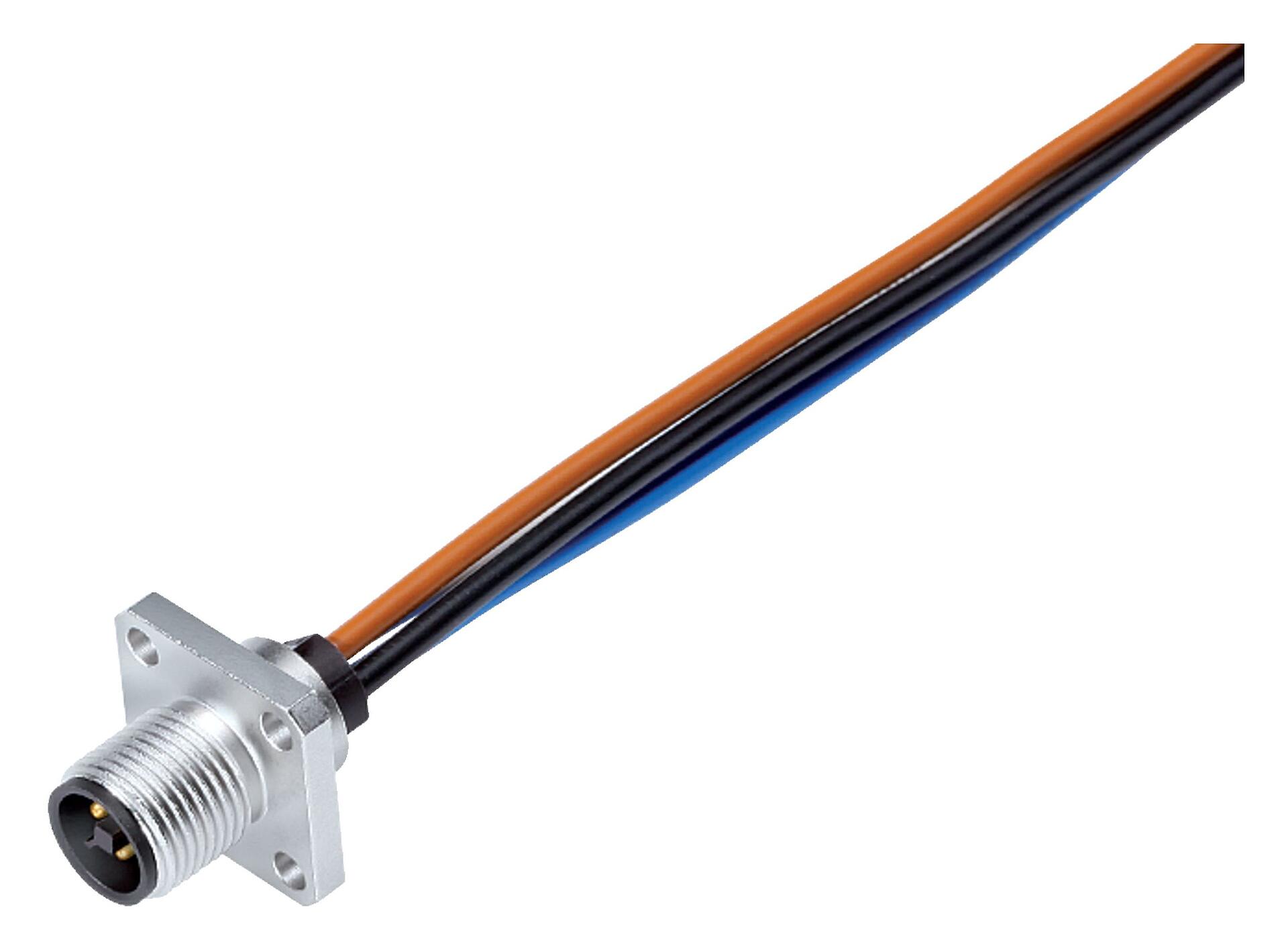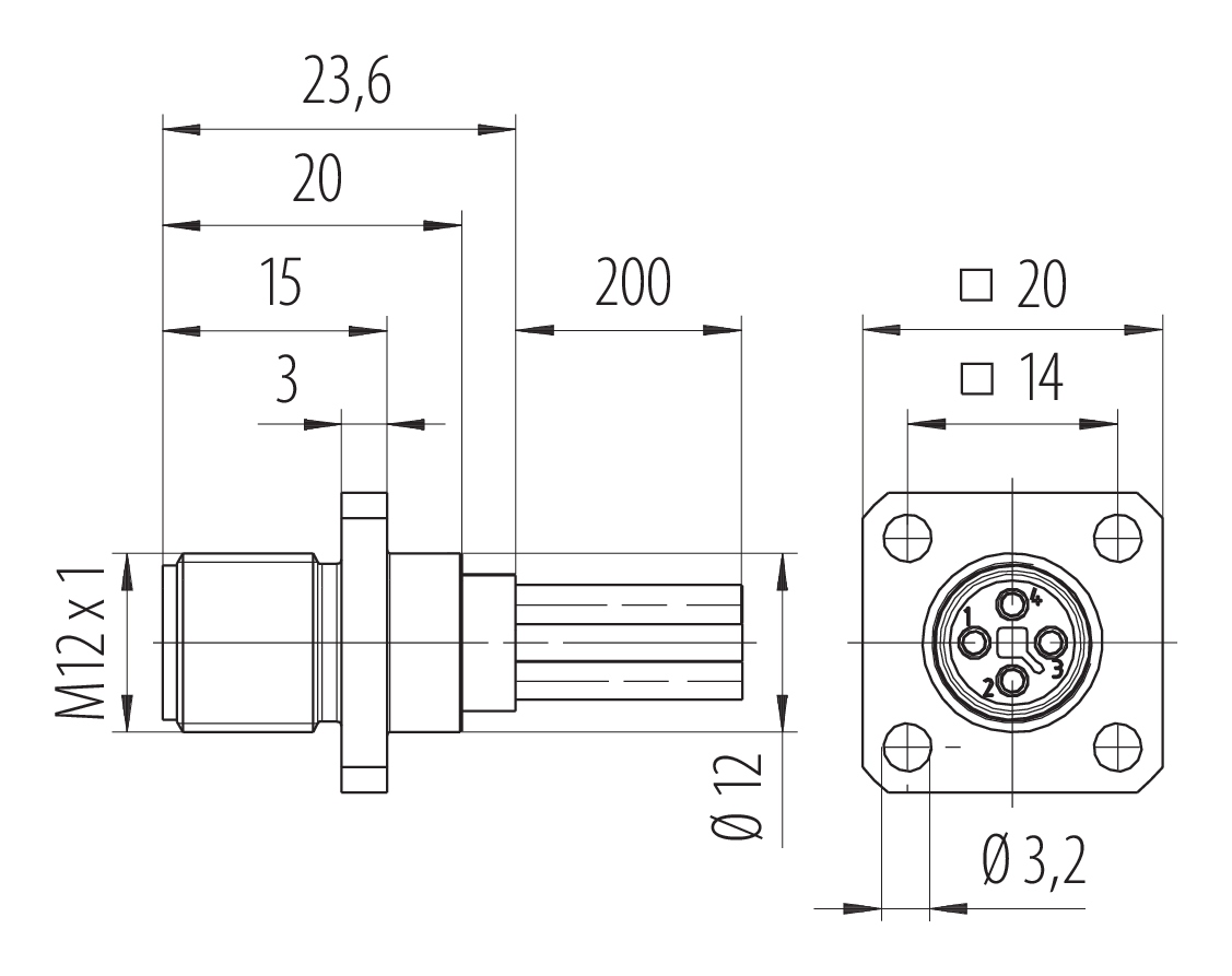 M12 квадратный разъем-вилка для монтажа на панели, Количество полюсов: 4, не экранированный, одножильные провода, IP40, UL 2238, M3 (4x), Фронтальное крепление