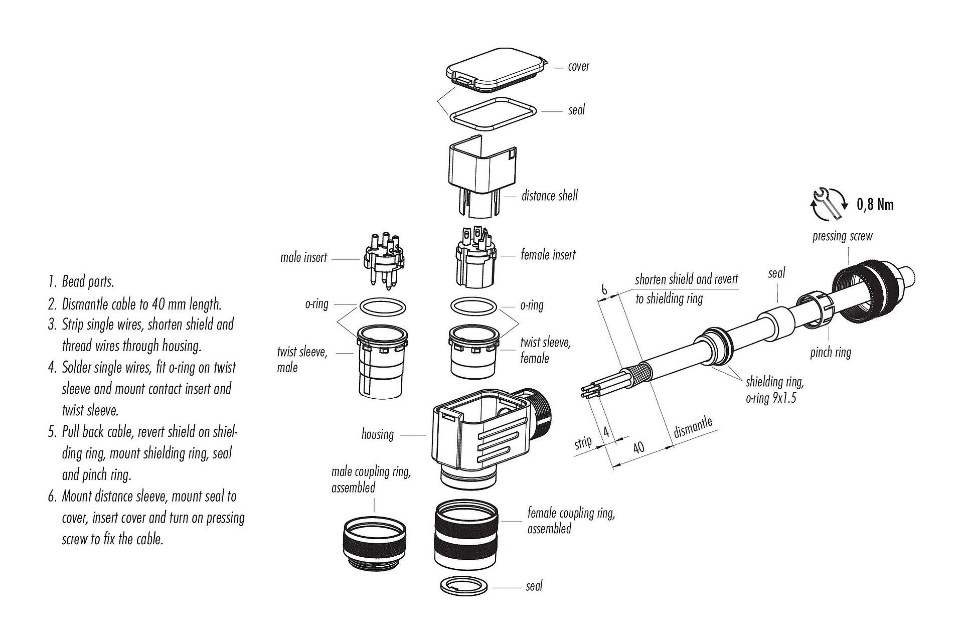 8. Kaapeliliittimen lukitsemiseksi laiteliittimellä kierteitetty rengas kiristetään "käsin tiukasti" (noin 60 cNm).
