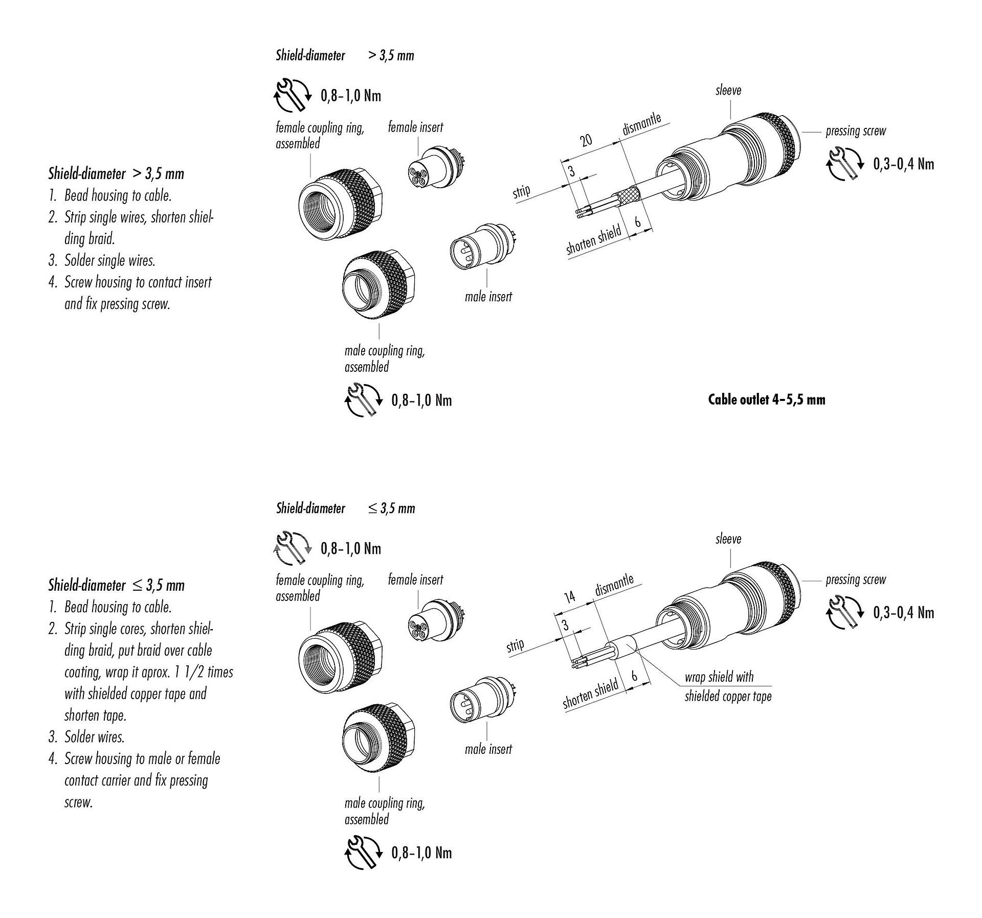 M9 オスコネクタケーブル, 極数: 5, 4.0-5.5mm, シールド可能, はんだ, IP67, アイリスフェーダー