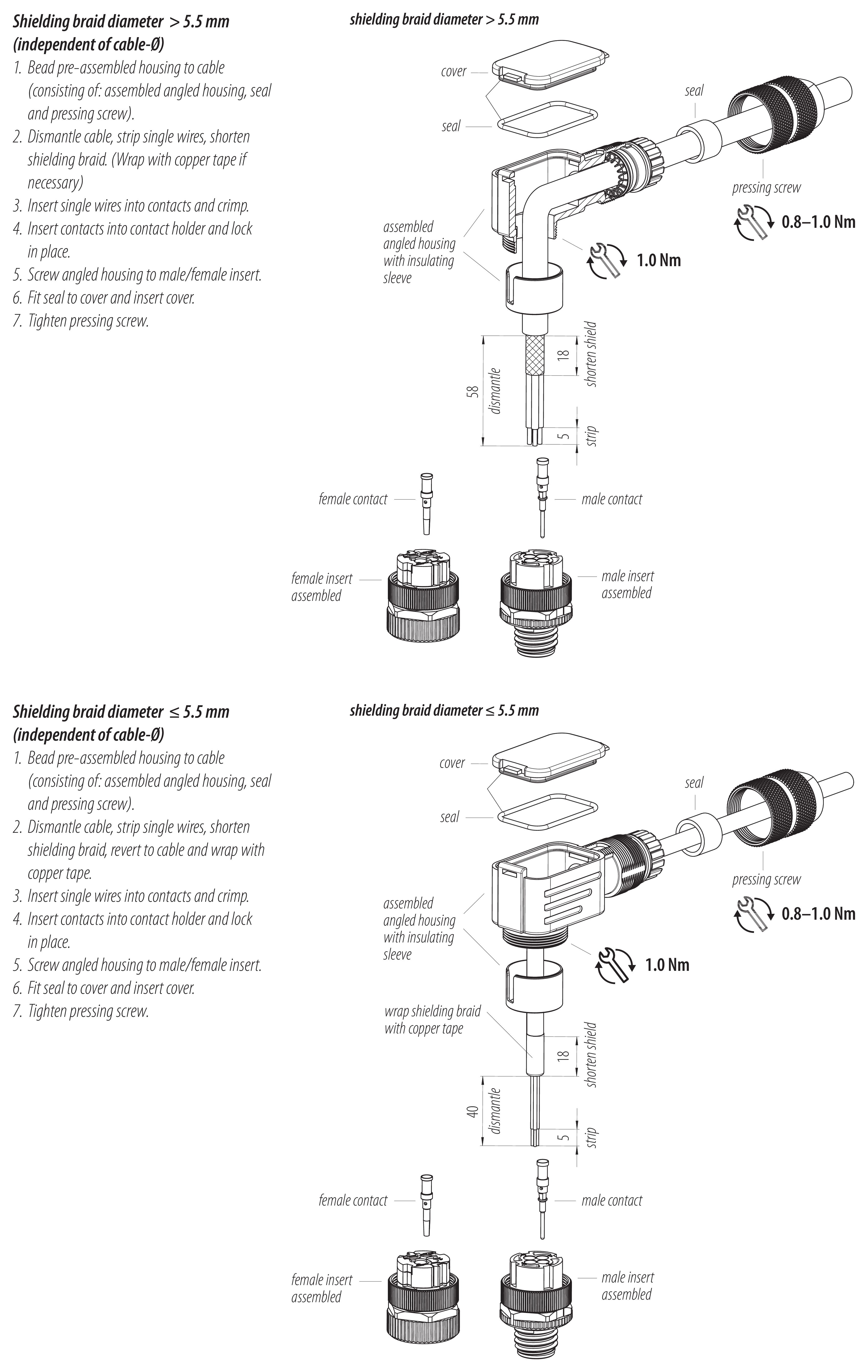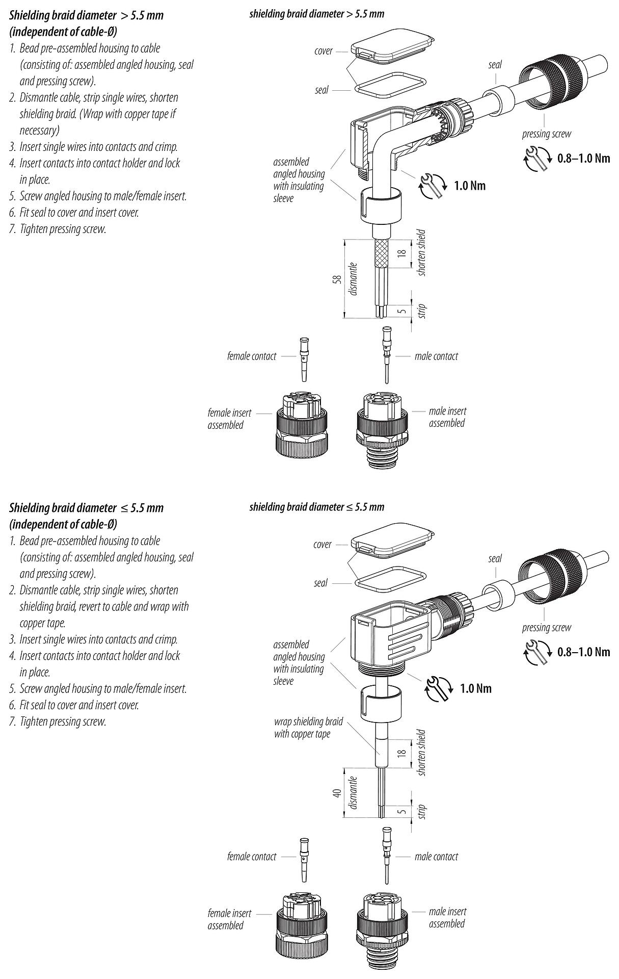- 为防止意外打开连接器,当使用在有触碰危险的电压的电路中时,必须用合适的氰基丙烯酸酯粘合剂将外壳和连接器头之间的螺纹固定。这不适用于符合IEC 61140 (EN 61140, VDE 0140-1)的SELV和PELV电路中使用的连接器。