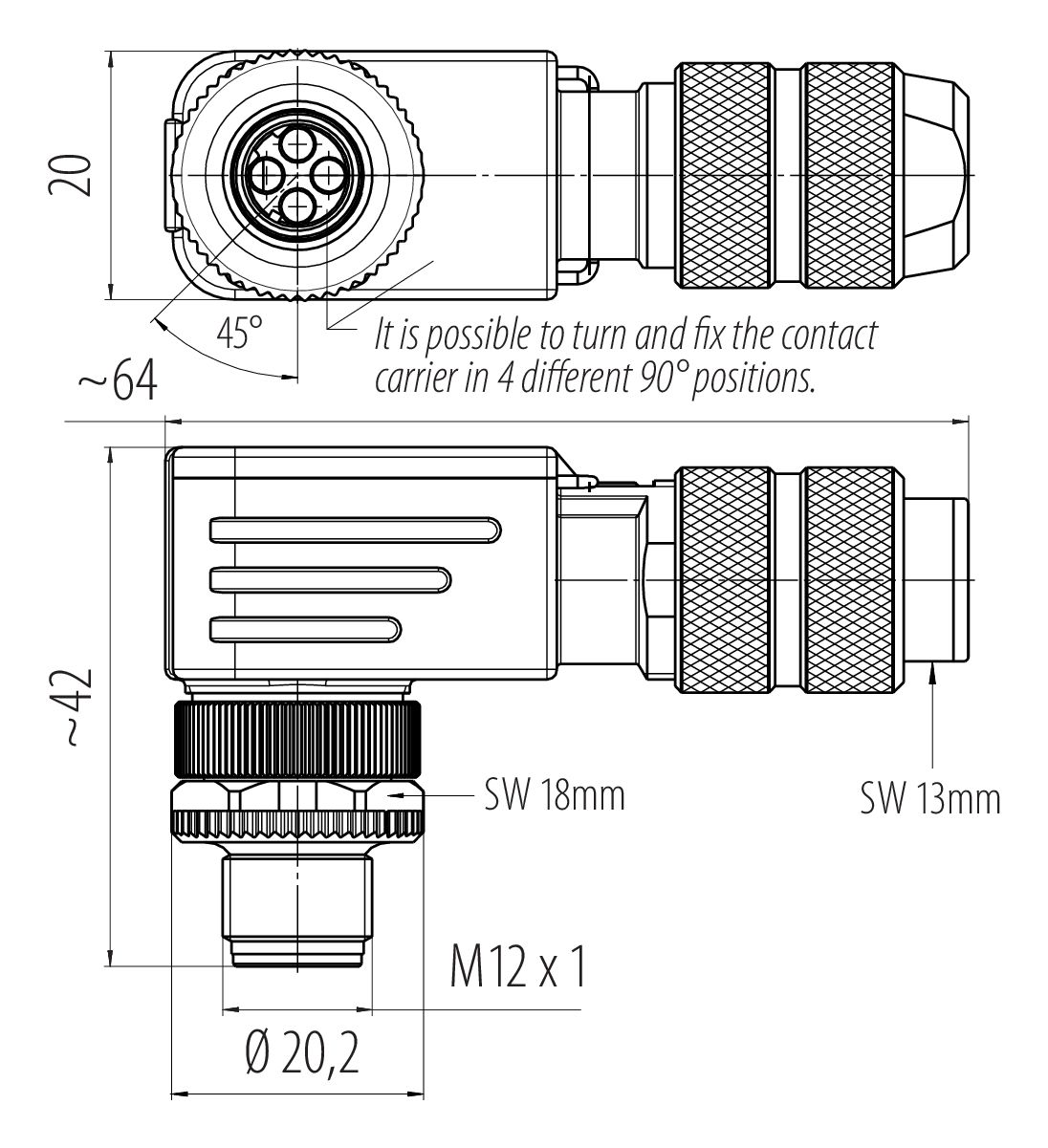 M12 彎角針頭電纜連接器, : 4, 5.0-8.0mm, 可接遮罩, 壓接(壓接觸點必須單獨訂購), IP67