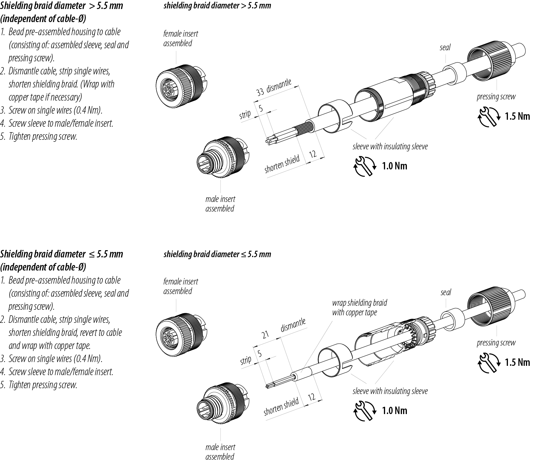 - 为了将电缆接头与设备接头锁紧,螺纹环要用 "手拧紧"(约60 cNm)。