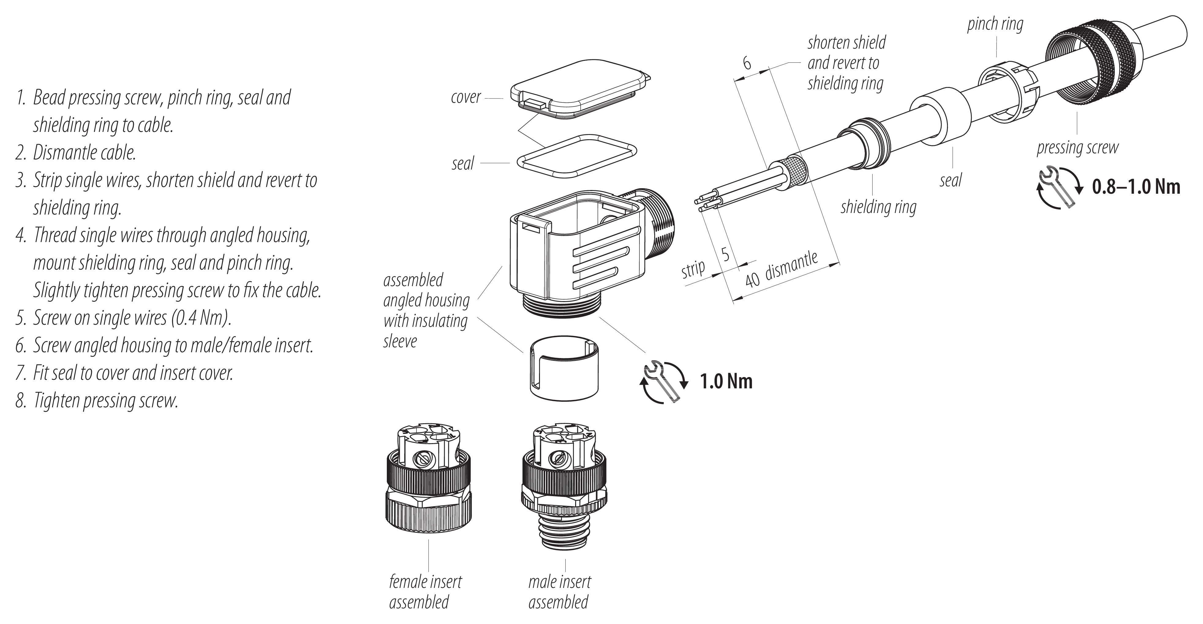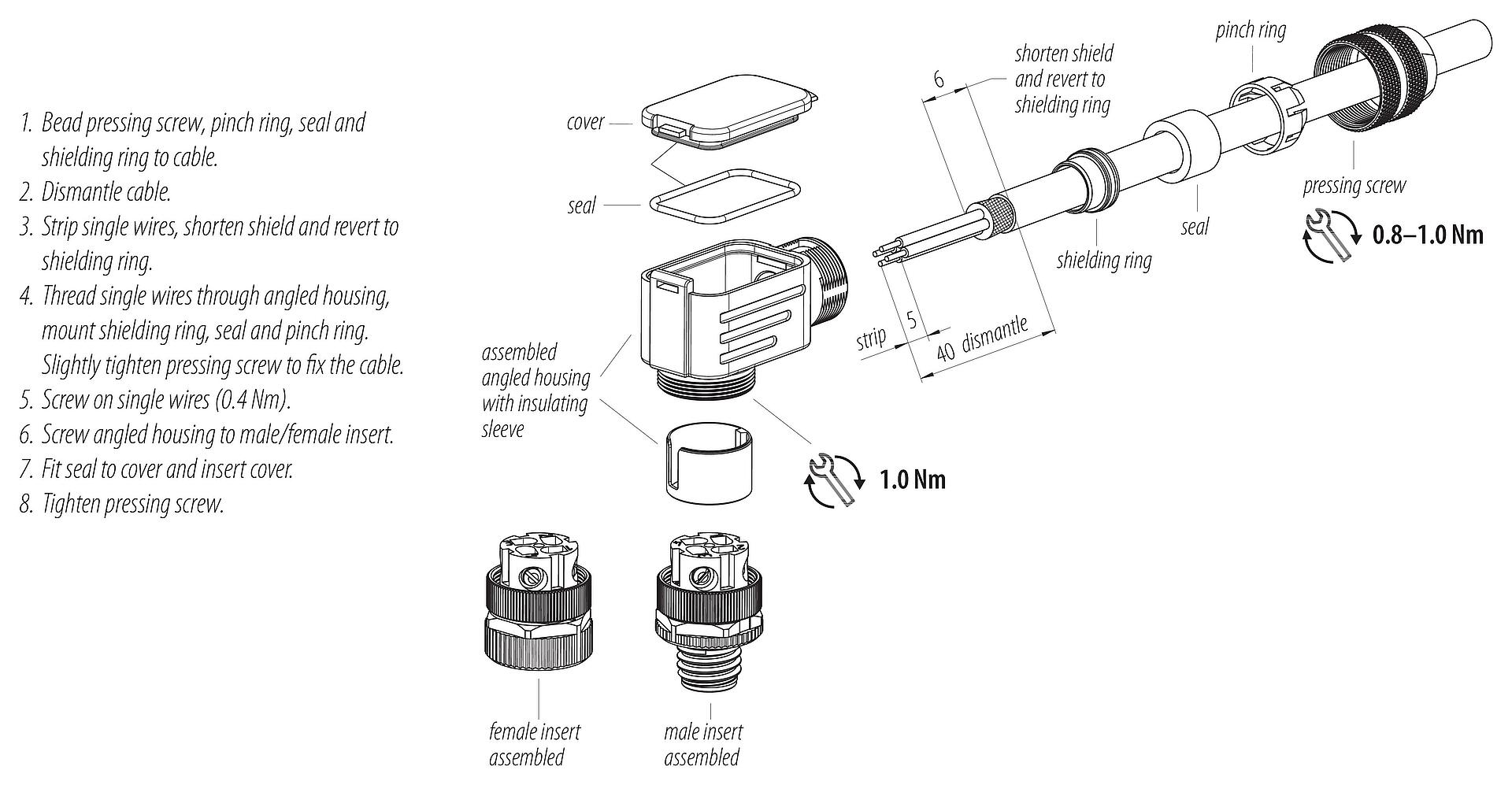 - 为防止意外打开连接器,当使用在有触碰危险的电压的电路中时,必须用合适的氰基丙烯酸酯粘合剂将外壳和连接器头之间的螺纹固定。这不适用于符合IEC 61140 (EN 61140, VDE 0140-1)的SELV和PELV电路中使用的连接器。