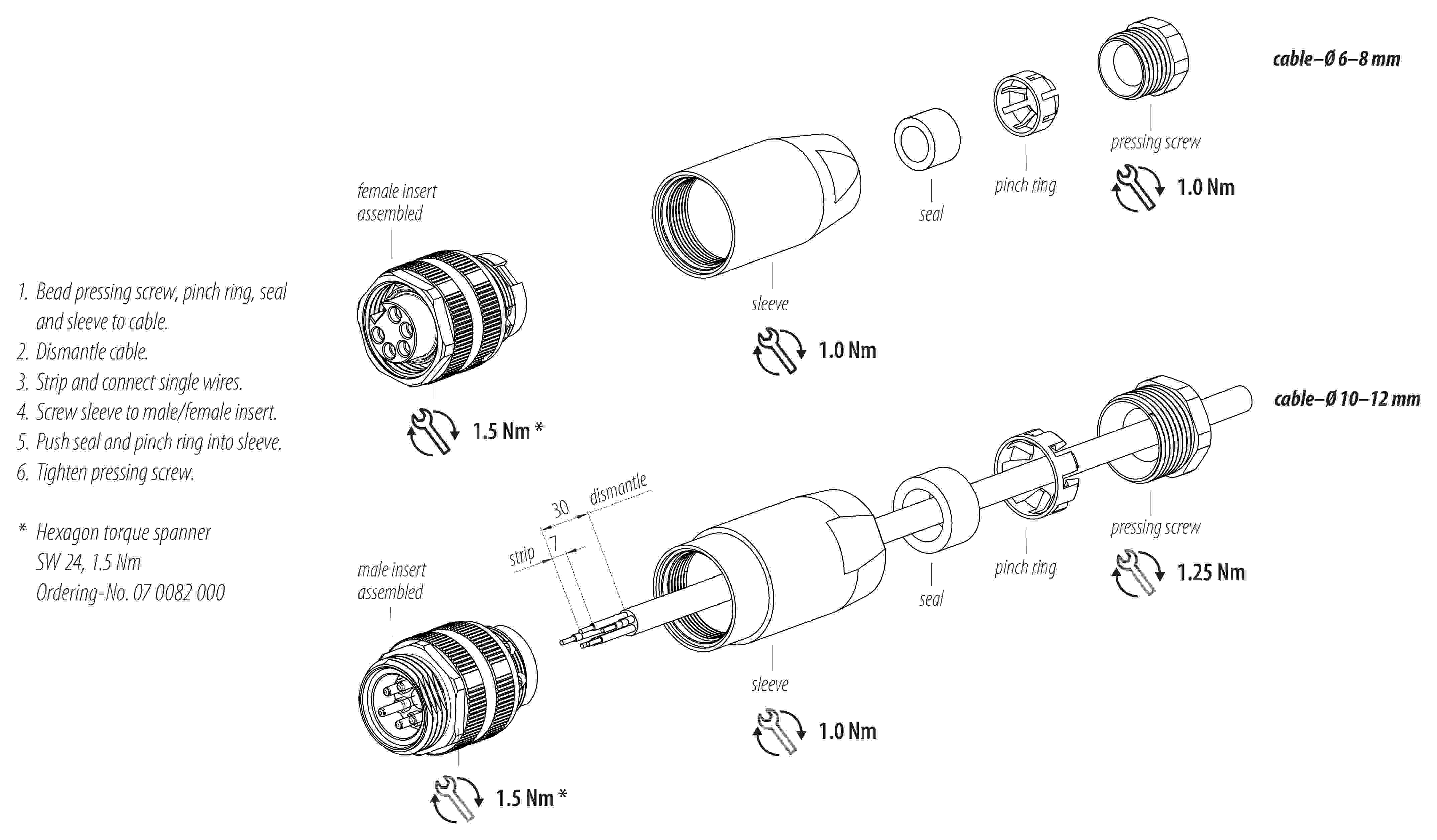 - Để khóa đầu nối cáp với đầu nối thiết bị, nên siết chặt vòng ren với lực 1,5 Nm. Cờ lê lực thích hợp có sẵn như một phụ kiện (mã đặt hàng 07 0082 000).