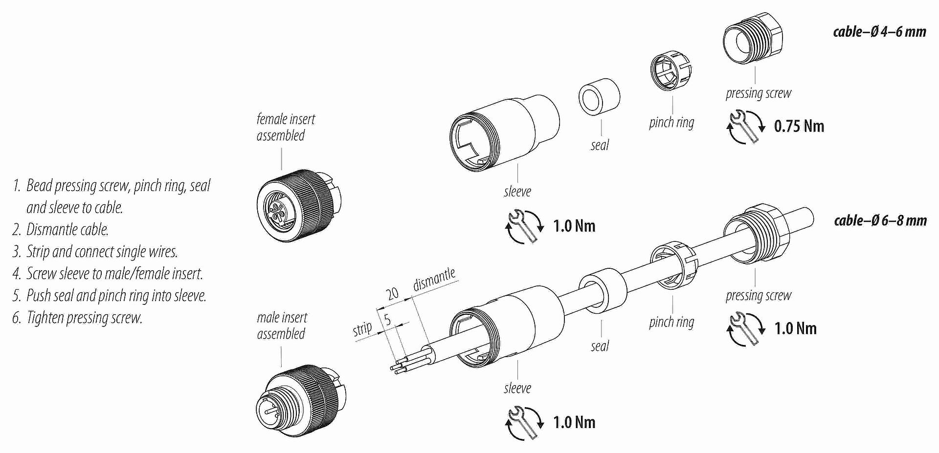 - 为了将电缆接头与设备接头锁紧,螺纹环要用 "手拧紧"(约60 cNm)。
